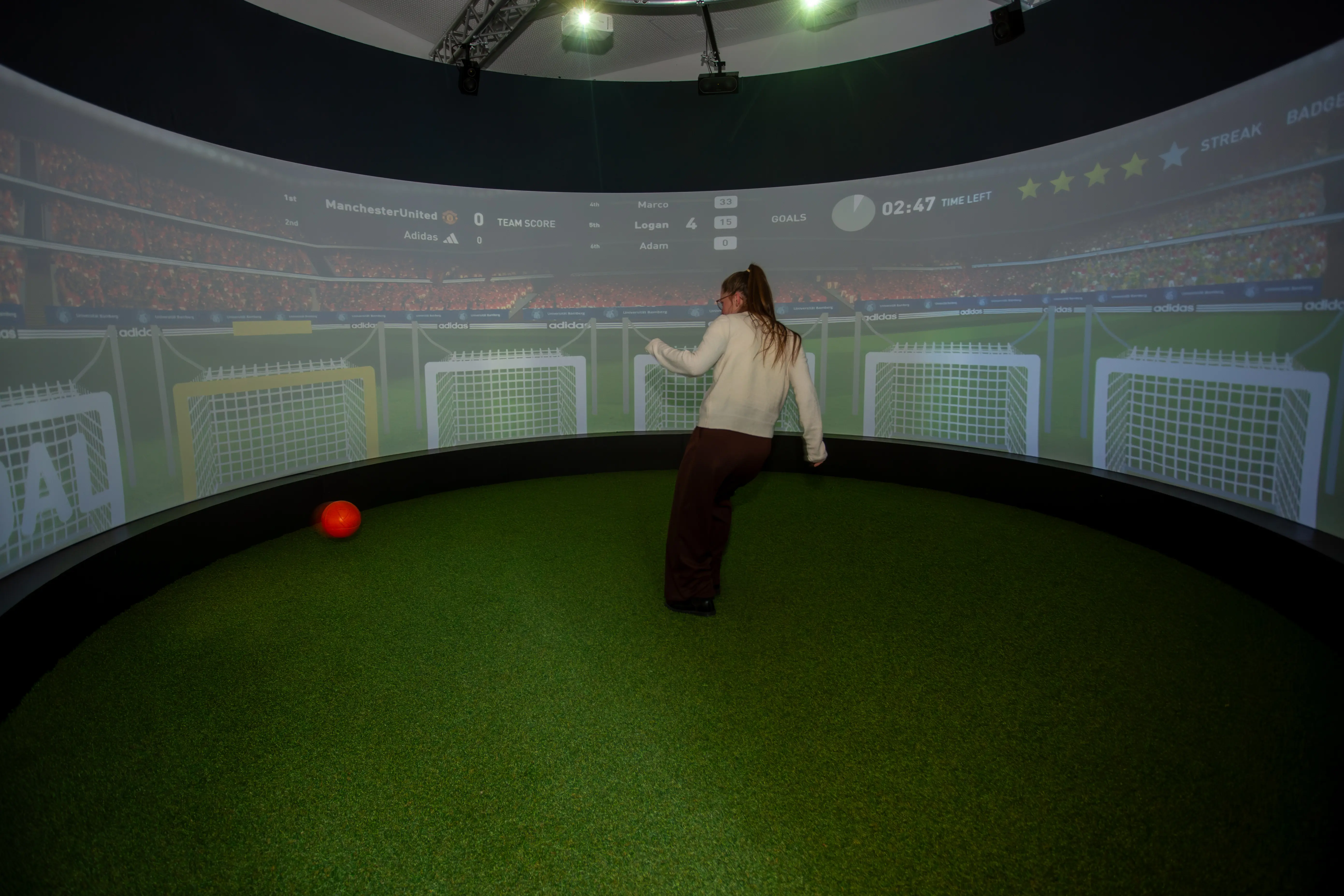 Kreisrund, schwarz, etwa sechs Meter Durchmesser, umgeben von Traversen, ein Hochleistungsrechner auf einem Rollwagen, dazu zwei orangene Fußbälle und Kunstrasen – was kann das sein? „Eine Oase natürlich!“, freut sich Prof. Benedikt Morschheuser, der an der WIAI Wirtschaftsinformatik mit dem Schwerpunkt Gamification lehrt.