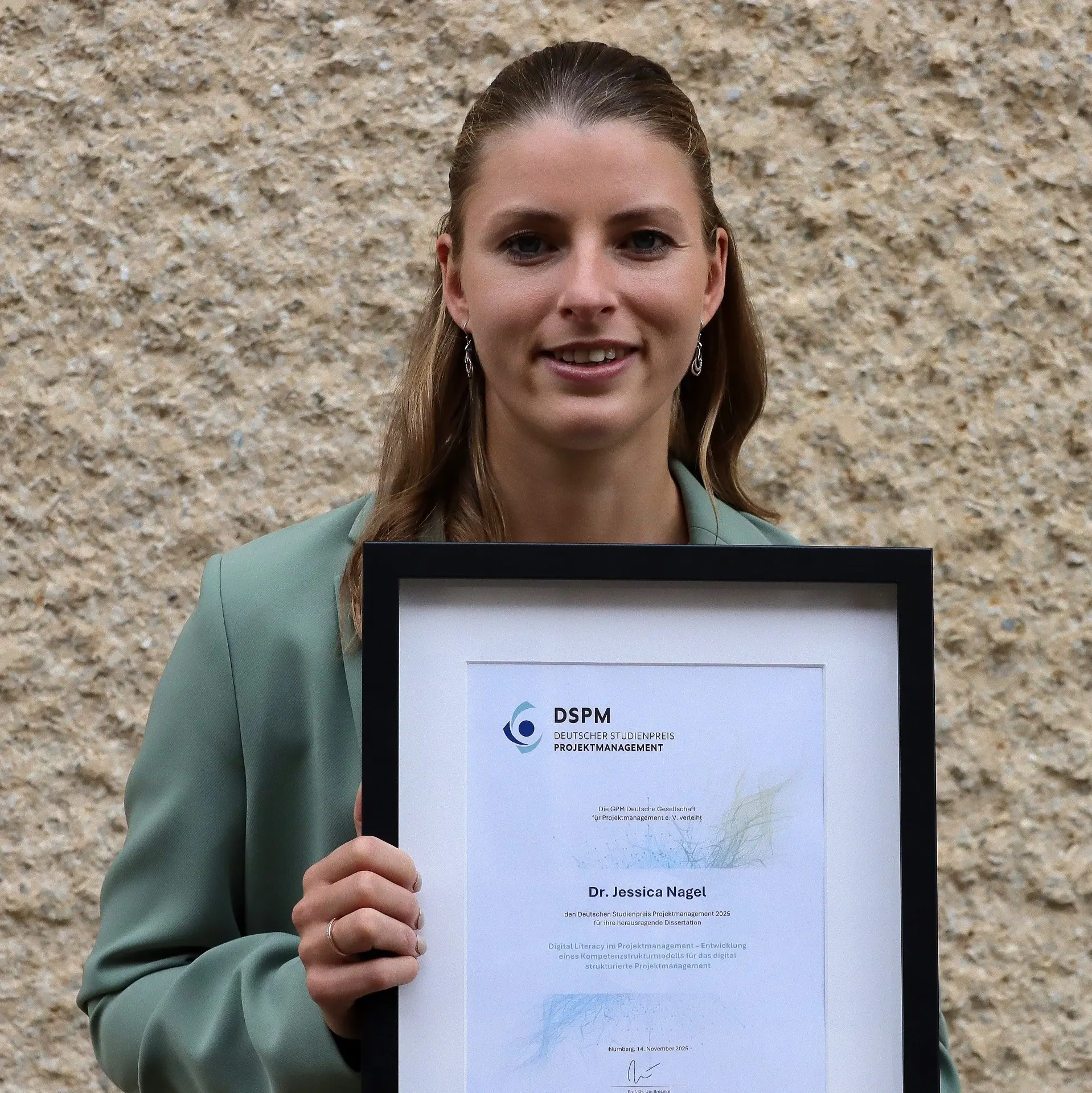 In der Kategorie „Dissertation“ erhält Dr. Jessica Nagel, externe Doktorandin des Fachgebiets Wirtschaftspädagogik (Prof. Dr. Karl-Heinz Gerholz), den Deutschen Studienpreis Projektmanagement 2025 für ihre Arbeit „Digital Literacy im Projektmanagement – Entwicklung eines Kompetenzstrukturmodells für das digital strukturierte Projektmanagement“.