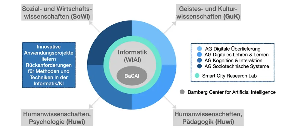 Die Technologieentwicklung wird getragen von Forscherinnen und Forschern der Angewandten Informatik, während die Vielfalt der Anwendungsperspektiven durch informatik-nah forschende Mitglieder aus anderen Fächern vertreten werden. Die Gründungsmitglieder stammen aus allen vier Fakultäten der Universität.