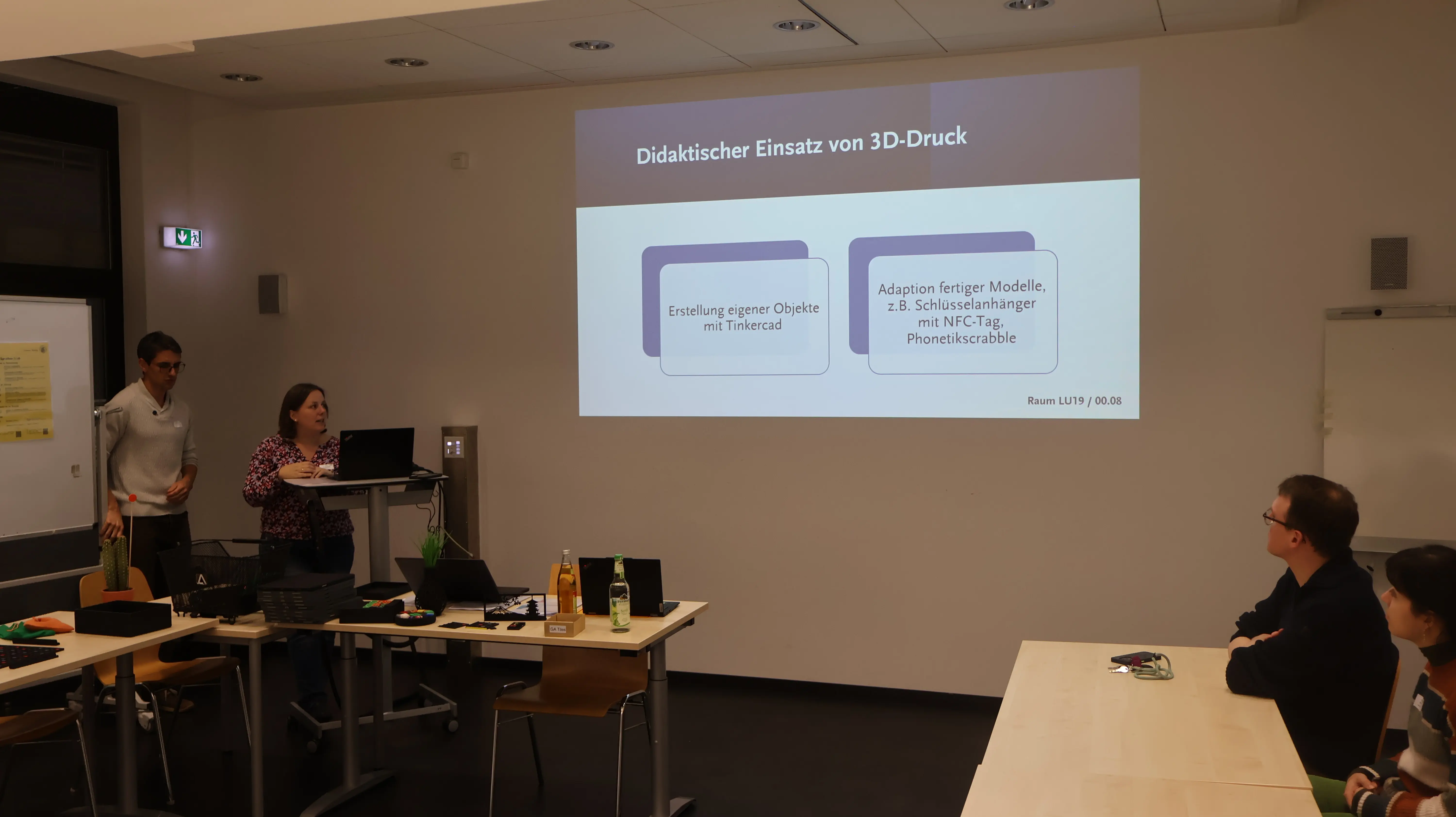 Im Workshop „3D-Druck“ gaben die Referierenden Nicholas Peterson und Dr. Anja Gärtig-Daugs eine praxisnahe Einführung in den 3D-Druck. Es wurden unter anderem Einsatzmöglichkeiten in (hoch-)schulischen Lehrkontexten behandelt, um fachliche und digitale Kompetenzen zu fördern. Weiterhin wurde praktisch mit Tinkercad gearbeitet, sowie eigene 3D-Objekte erstellt. Schließlich wurde sich mit Chancen und Herausforderungen bei der Lehr- und Unterrichtskonzeption mit 3D-Druck auseinandergesetzt.