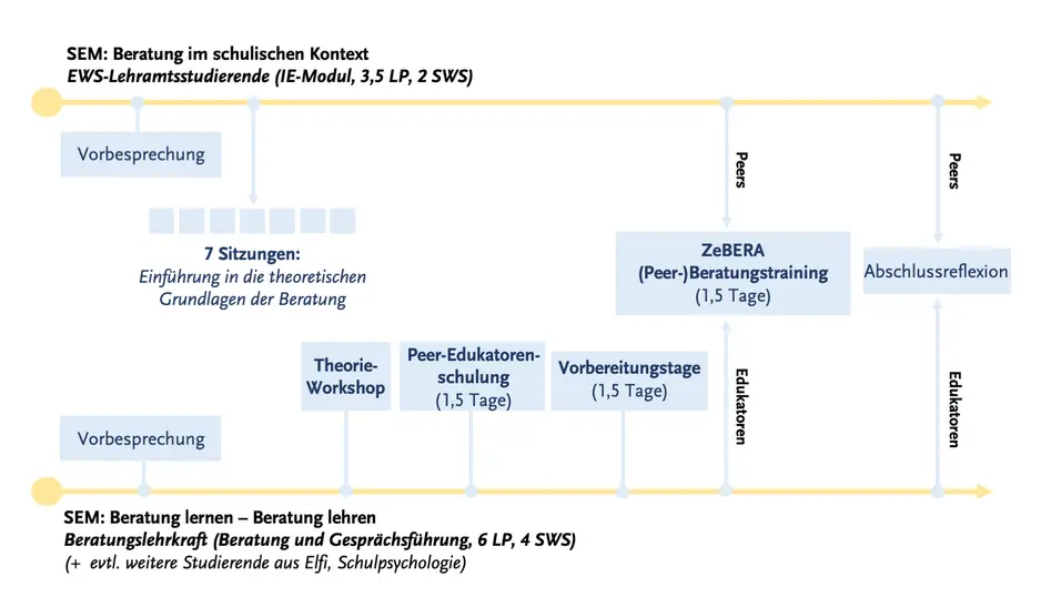 Im Seminar Beratung im schulischen Kontext erwerben die Lehramtsstudierenden (Peers) zunächst an einem Blockwochenende grundlegende beratungsbezogene Wissensinhalte. Mit diesem Grundlagenwissen ausgestattet, besuchen sie anschließend als Teilnehmende das ZeBERA Peer-Beratungstraining, bei dem sie im geschützten Raum von ausgebildeten Peer-Edukator:innen in Kleingruppen begleitet werden.